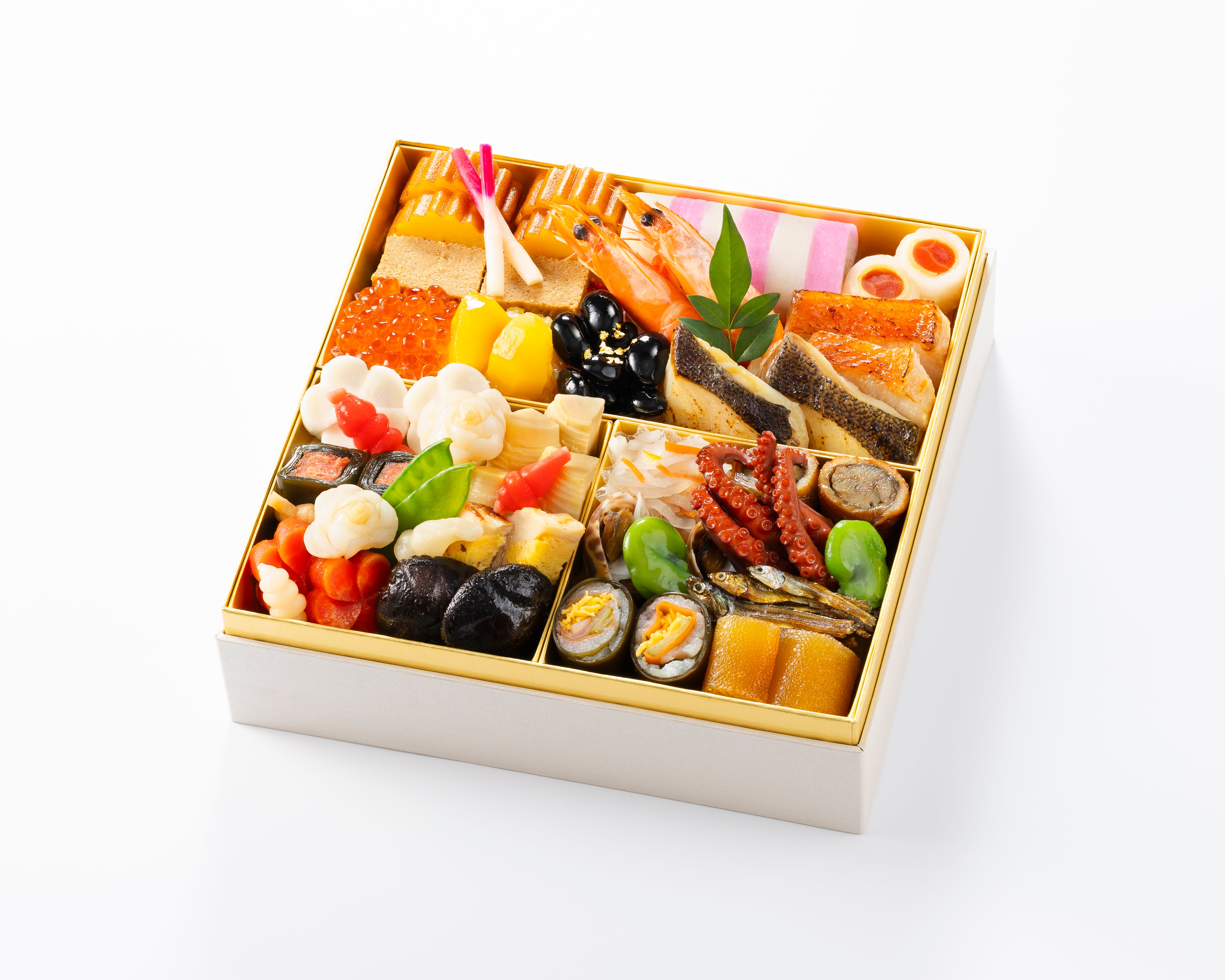 栗きんとん、黒豆金箔のせ、銀鱈西京焼き、金目鯛柚香焼き、